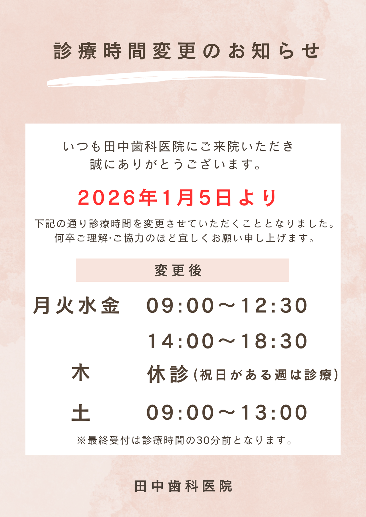 この度働き方改革の一環として、2026年1月5日より診療日および診療時間の変更をさせて頂くこととなりました。